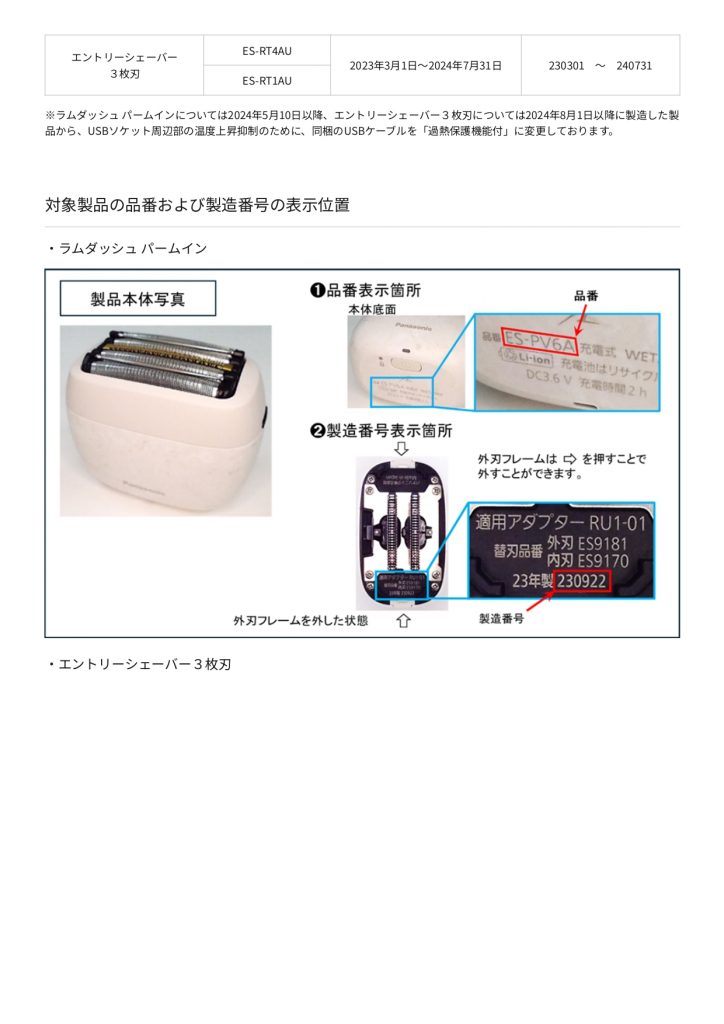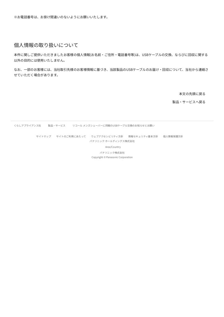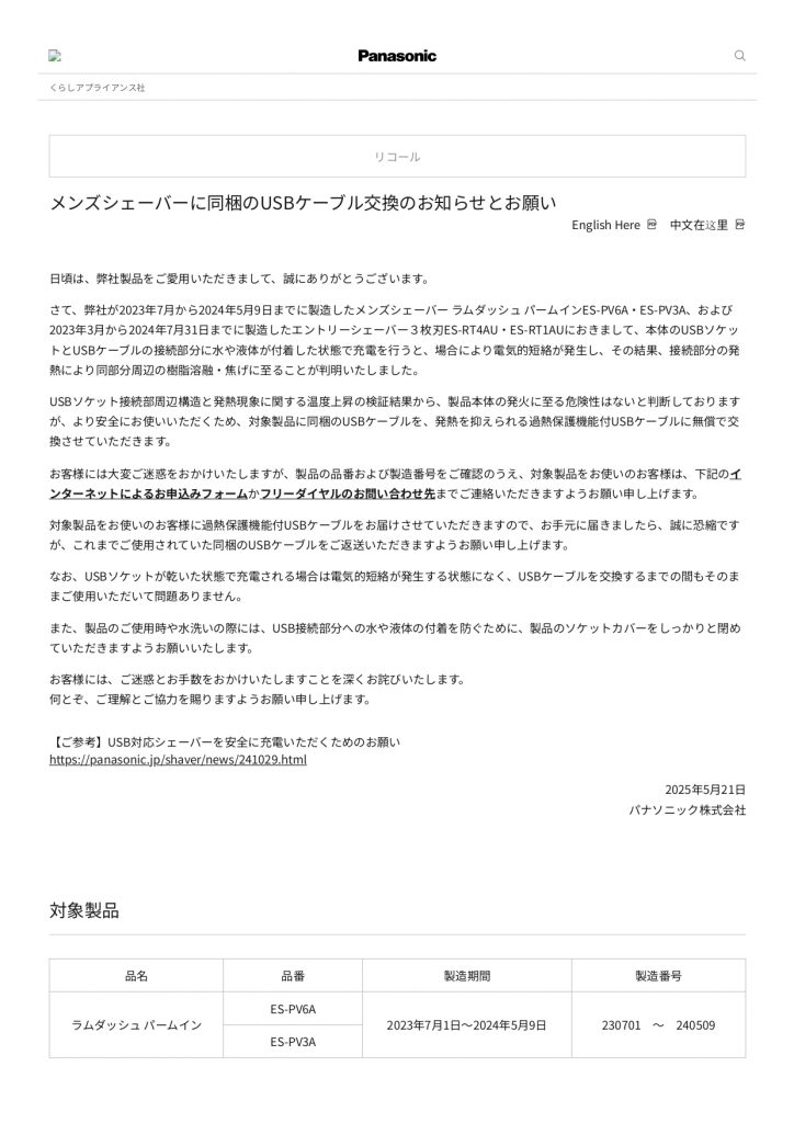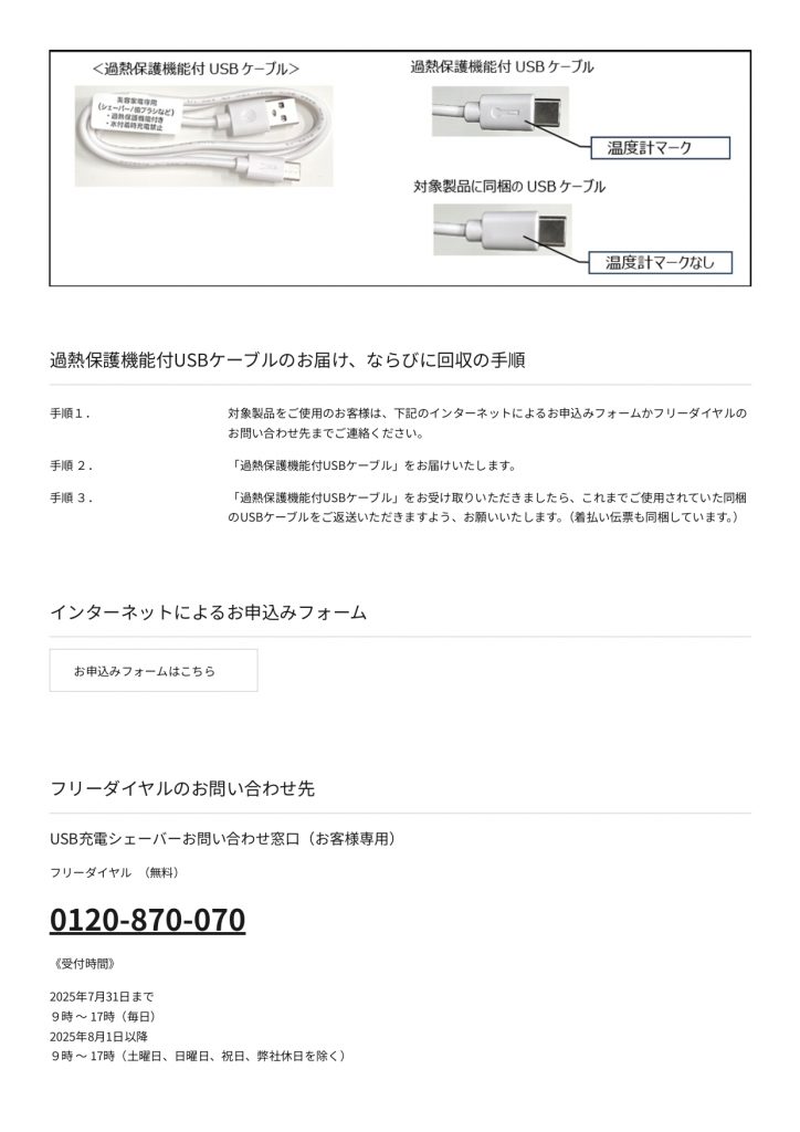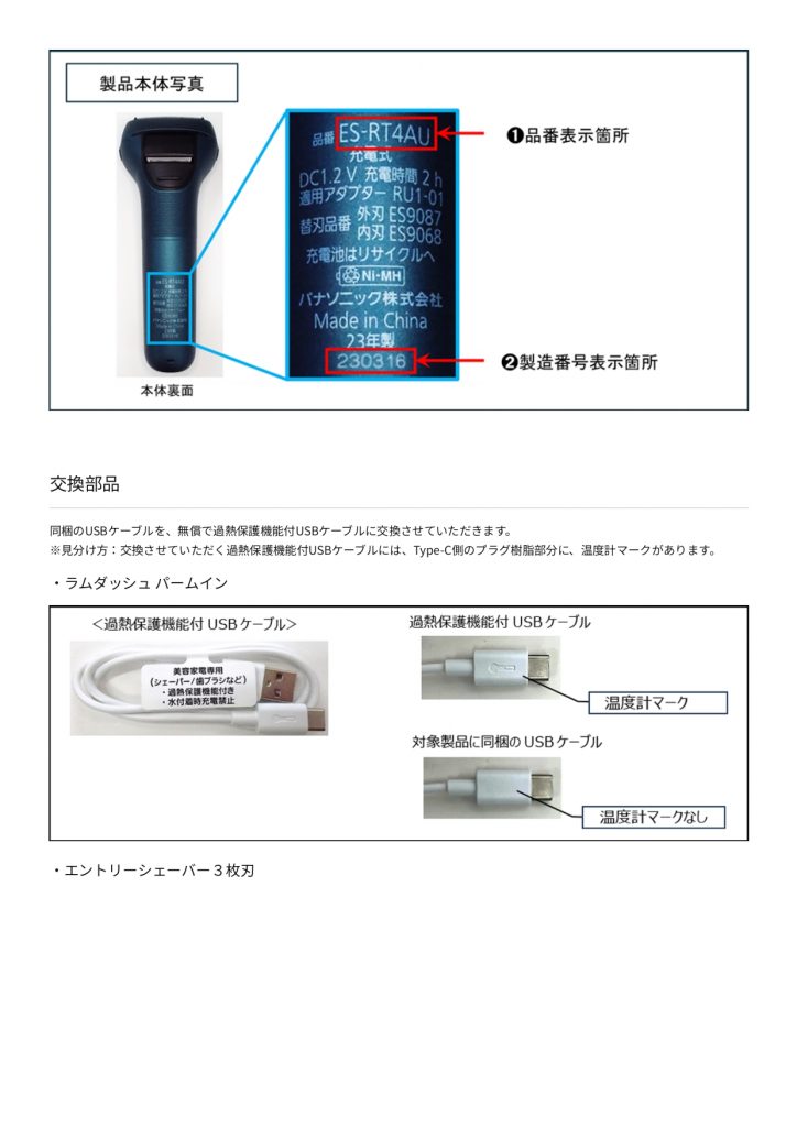 メンズシェーバーに同梱のUSBケーブル交換のお知らせとお願い