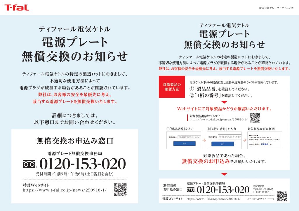 ティファール電気ケトル 電源プレート 無償交換のお知らせ