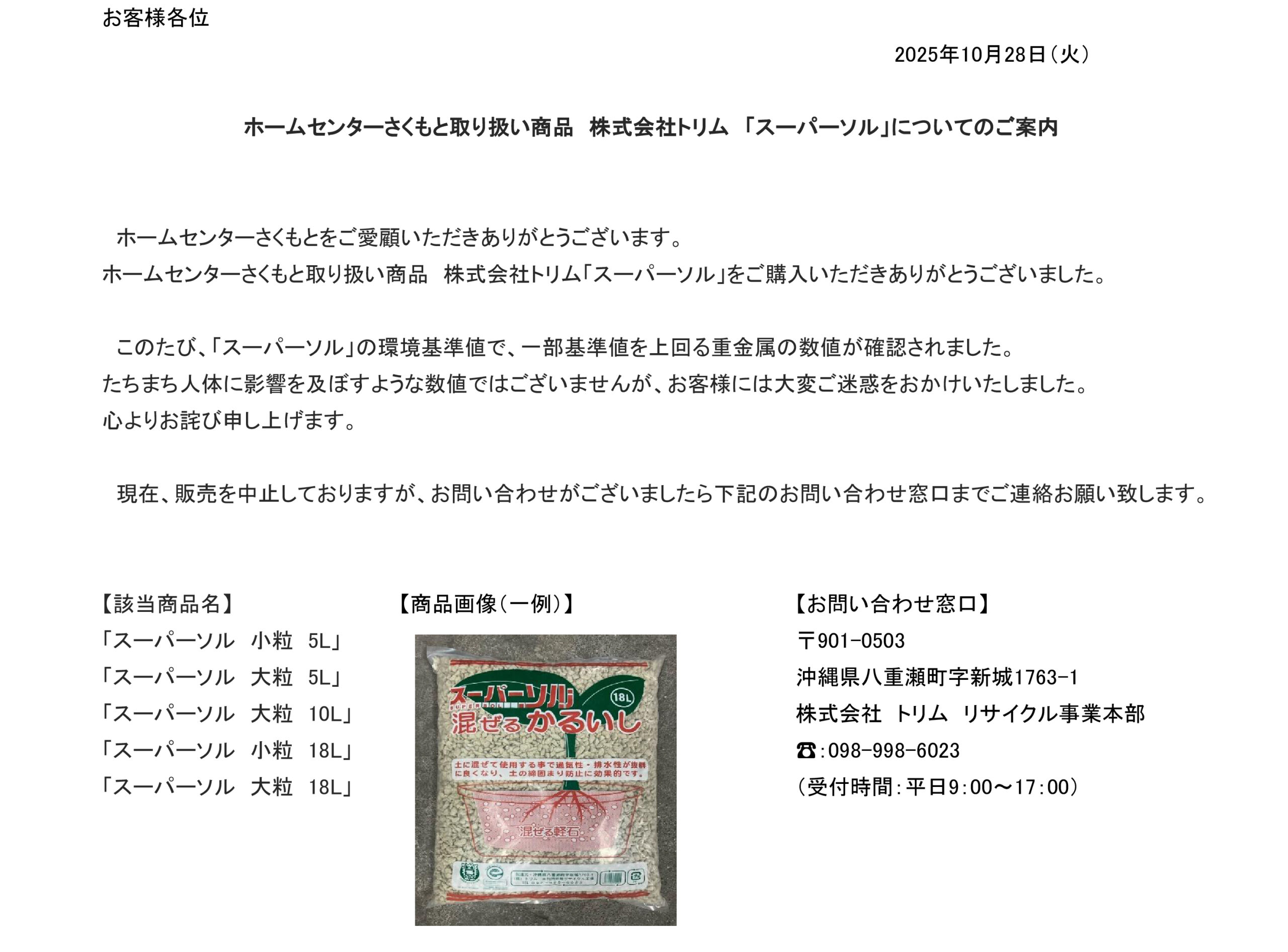> ホームセンターさくもと取り扱い商品 株式会社トリム 「スーパーソル」についてのご案内