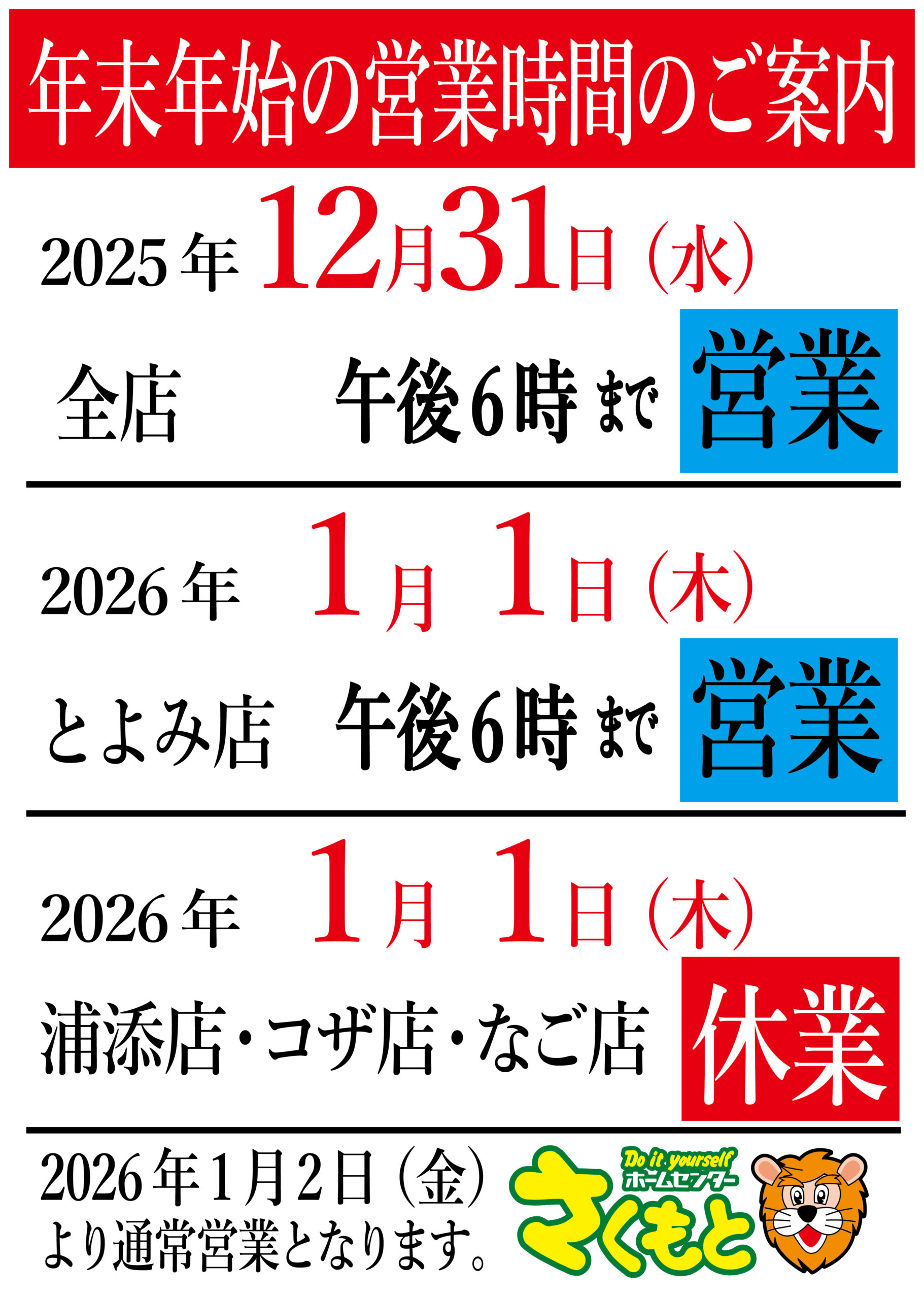 2026年1月1日(木)浦添店・コザ店・なご店は休業の為レンタルWeb予約を一時停止させて頂きますのでご了承下さい。