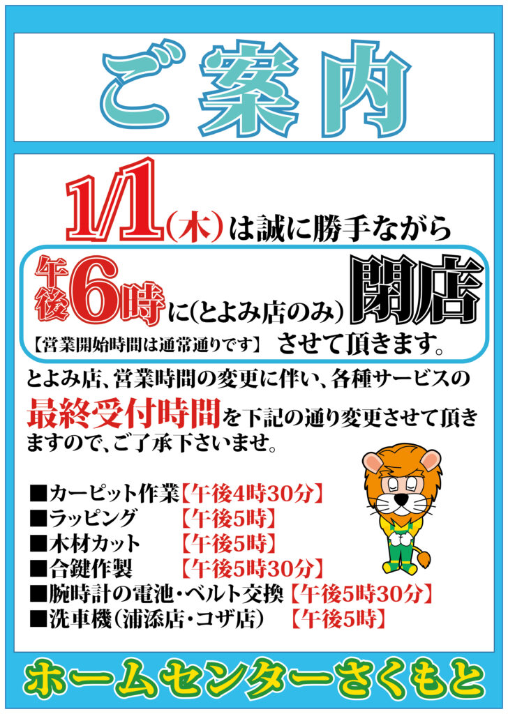 とよみ店は1月1日(木)18:00までの営業となりレンタルWeb予約は可能ですが返却時間が17:30までとなりますのでご了承ください。