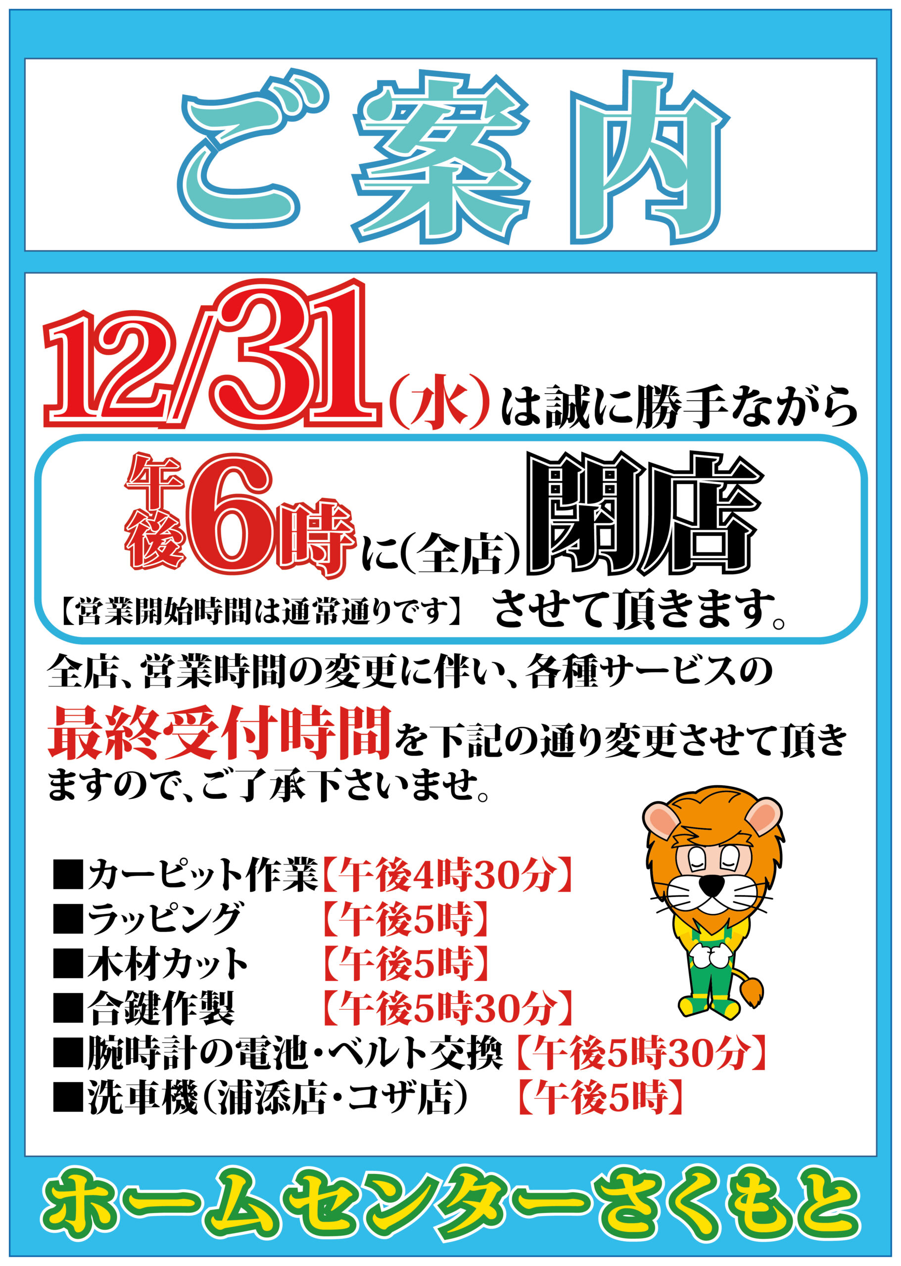 2025年12月31日(水)全店18:00までの営業となりますので返却時間が17:30までとなりますのでご了承ください。